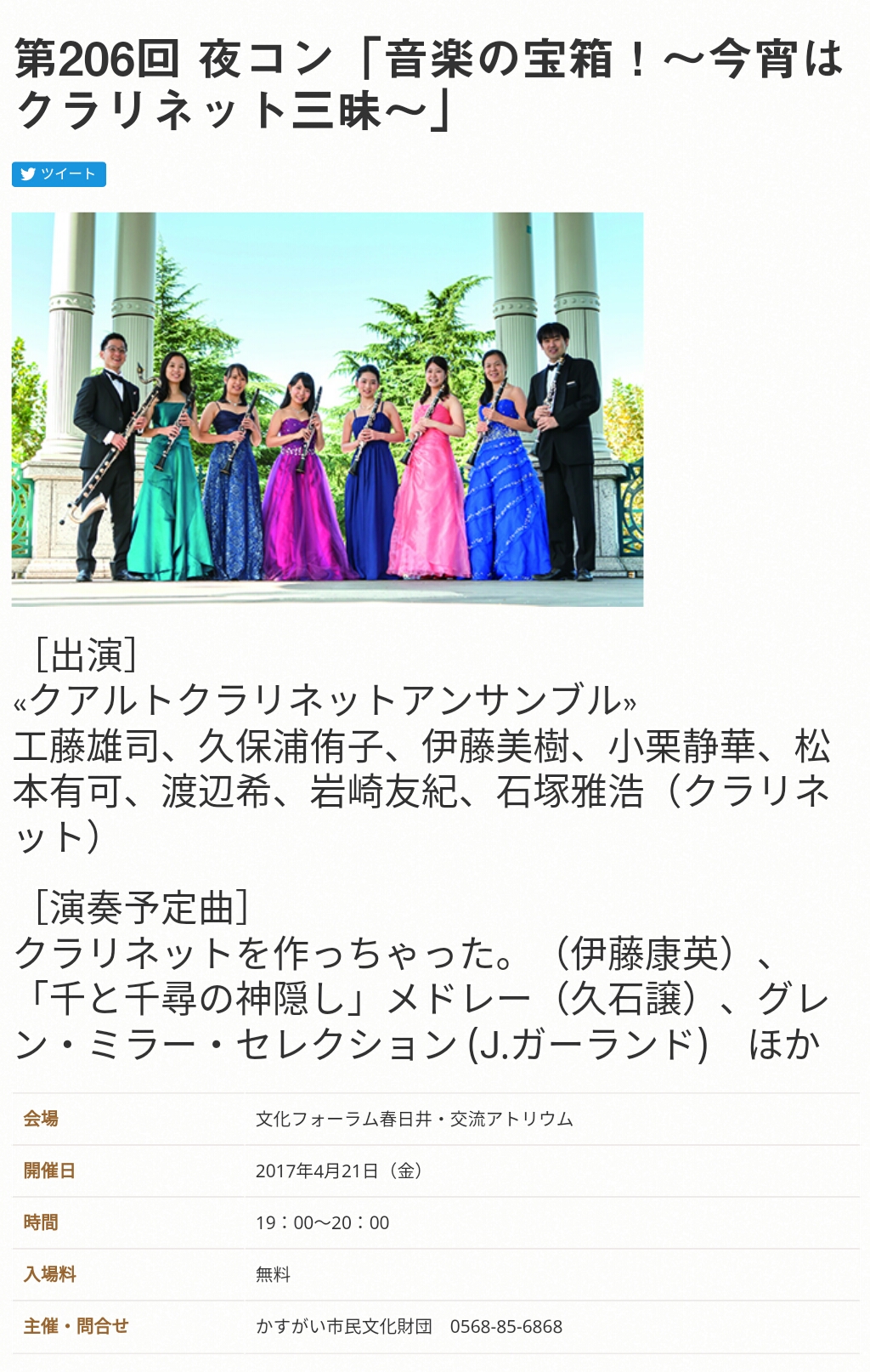 どちらの公演も8重奏を演奏しますし、春日井の夜コンは僕が「クラリネットを作っちゃった」のソロも吹きます。