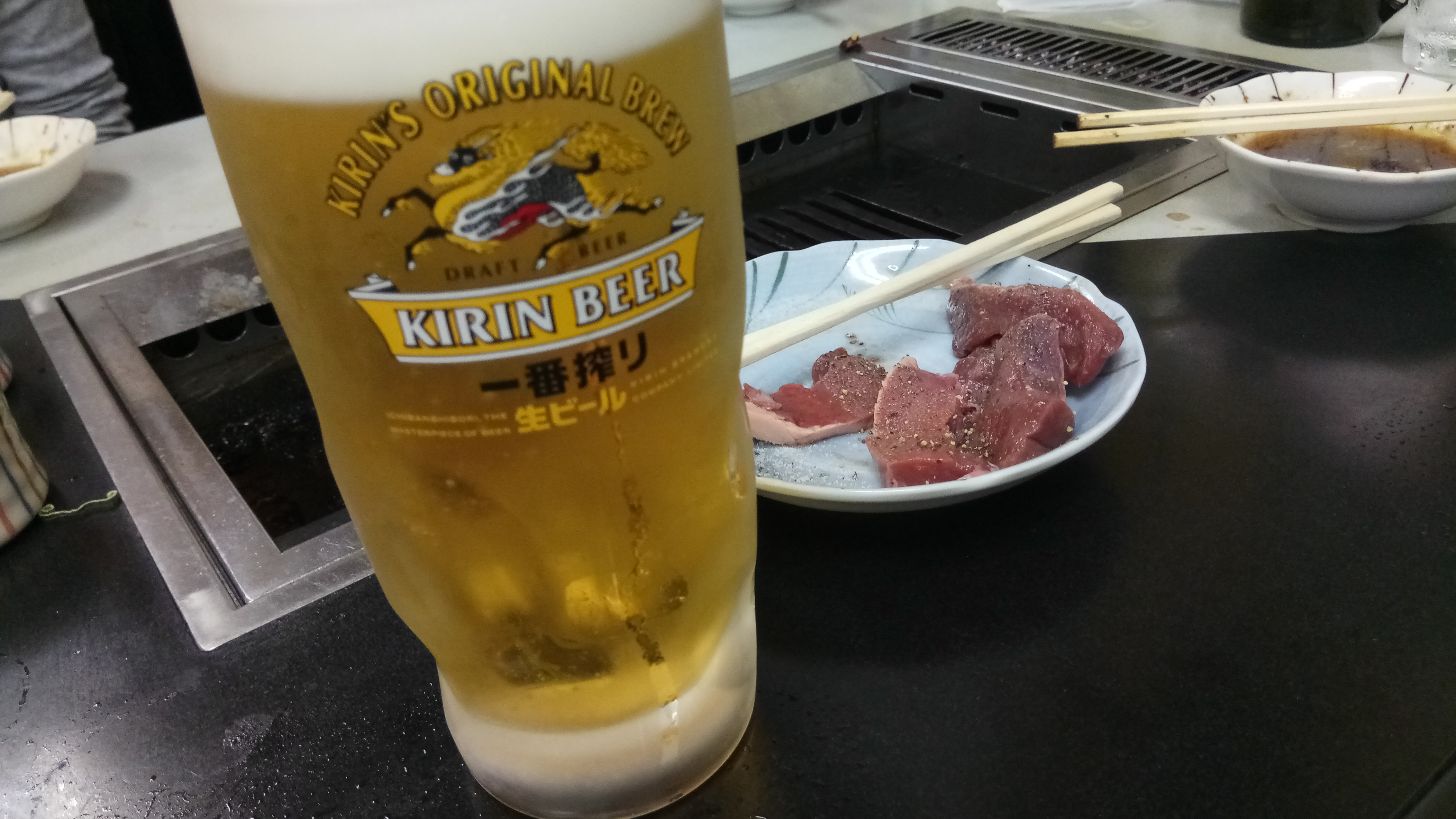 ↓ビールと心臓の焼肉ー。柔らかくておいしかった!