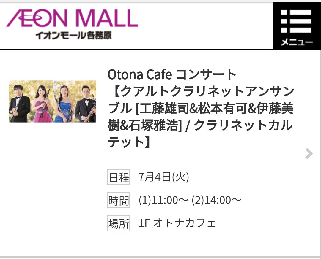 直前のご案内となってしまいましたが、7/4(火)に岐阜県の各務原市のイオンで、クアルトクラリネットアンサンブルの演奏をします。