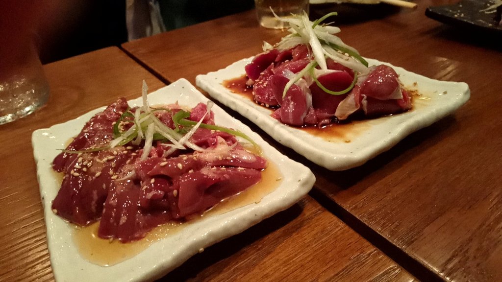↓鳥のレバ刺しと砂肝刺し。もうなかなか食べられない品ですが、やはり最高。レバーは苦手でもこれは食べられます。また行きたい!