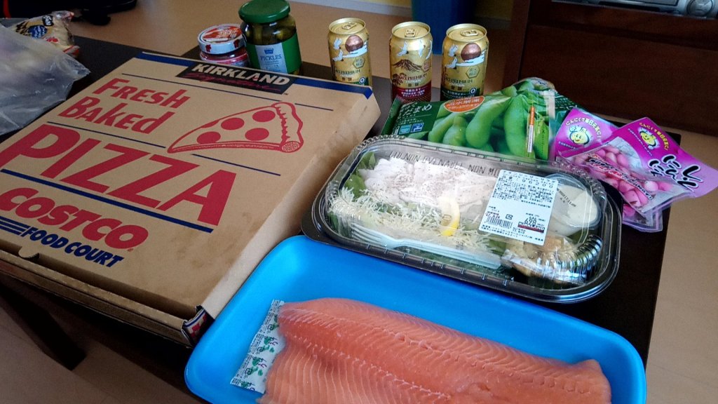 憧れのサーモンやめちゃくちゃでかいピザ、あとはシーザーサラダとかを買ってきてもらいましたよ。