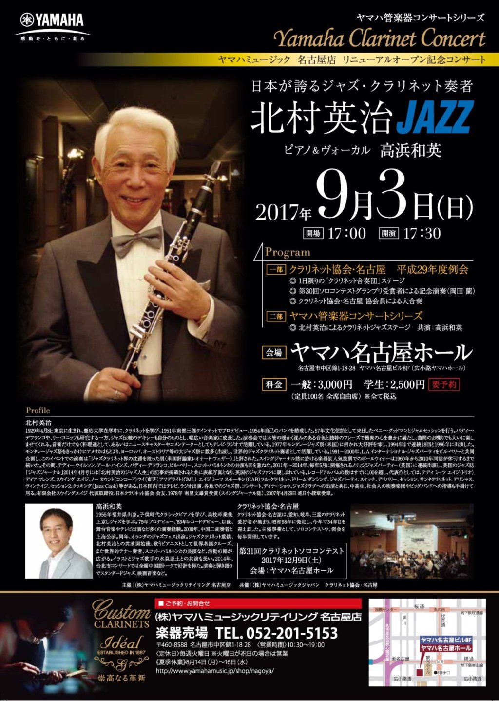 第二部は「ヤマハミュージック 名古屋店 リニューアルオープン記念コンサート」として、ジャズクラリネット奏者の北村英治氏をお招きし、ジャズのコンサートを聴いていただきます。
