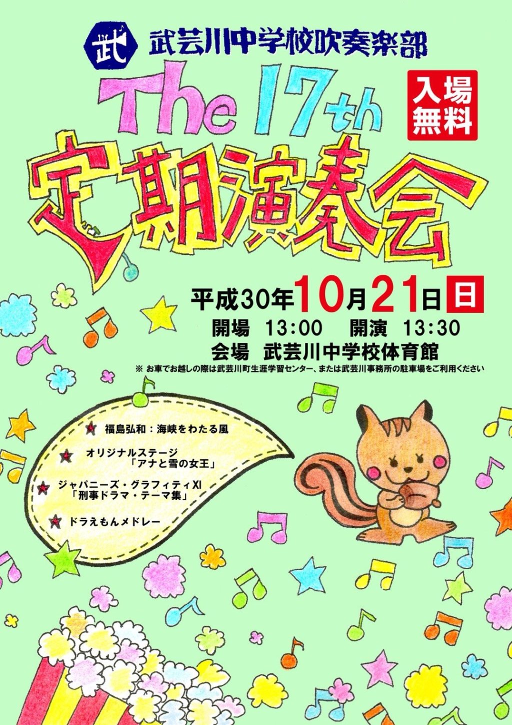 日にちは10月21日(日)で、13:30開演(13:00開場)、場所は武芸川中学校の体育館、入場料は無料です。