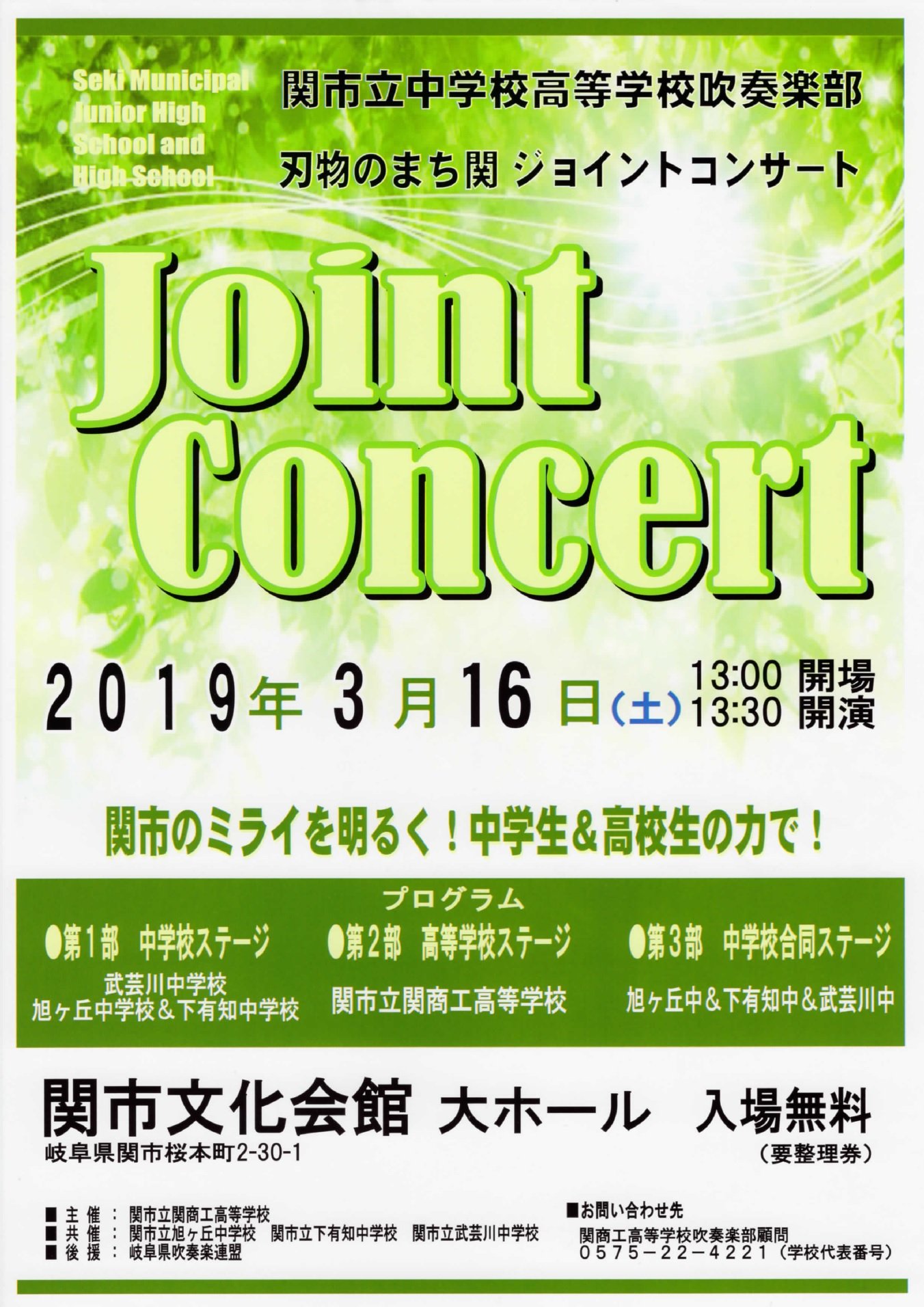 間近のご案内となってしまいましたが、3/16(土)に関市立中学校と高等学校の吹奏楽部のジョイントコンサートが関市文化会館で行われます。