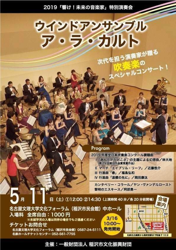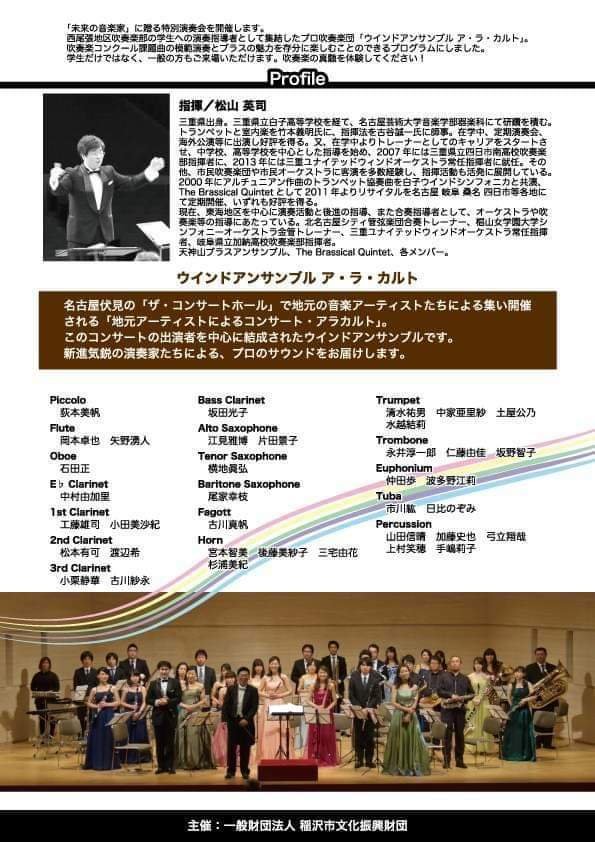 今年も稲沢市民会館にて、「響け!未来の音楽家」と題した演奏会に、アラカルトの吹奏楽団のメンバーとして出演します!