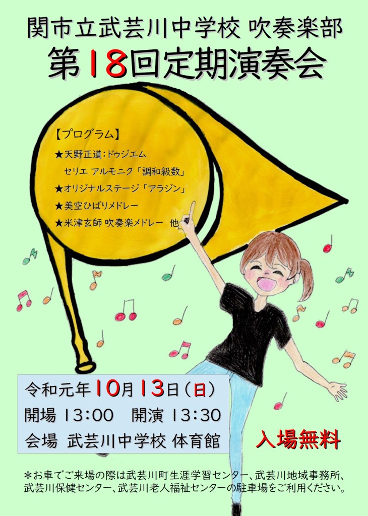 吹奏楽部の全体指導をしている、関市立武芸川中学校の第18回定期演奏会に、今年も指揮者として出演します。