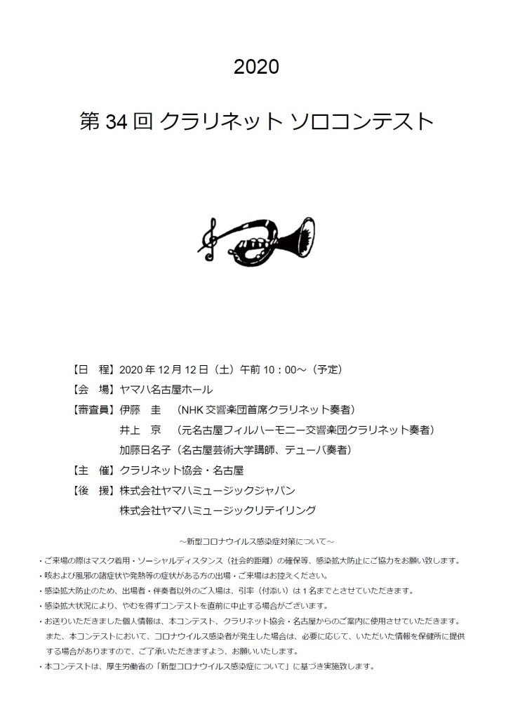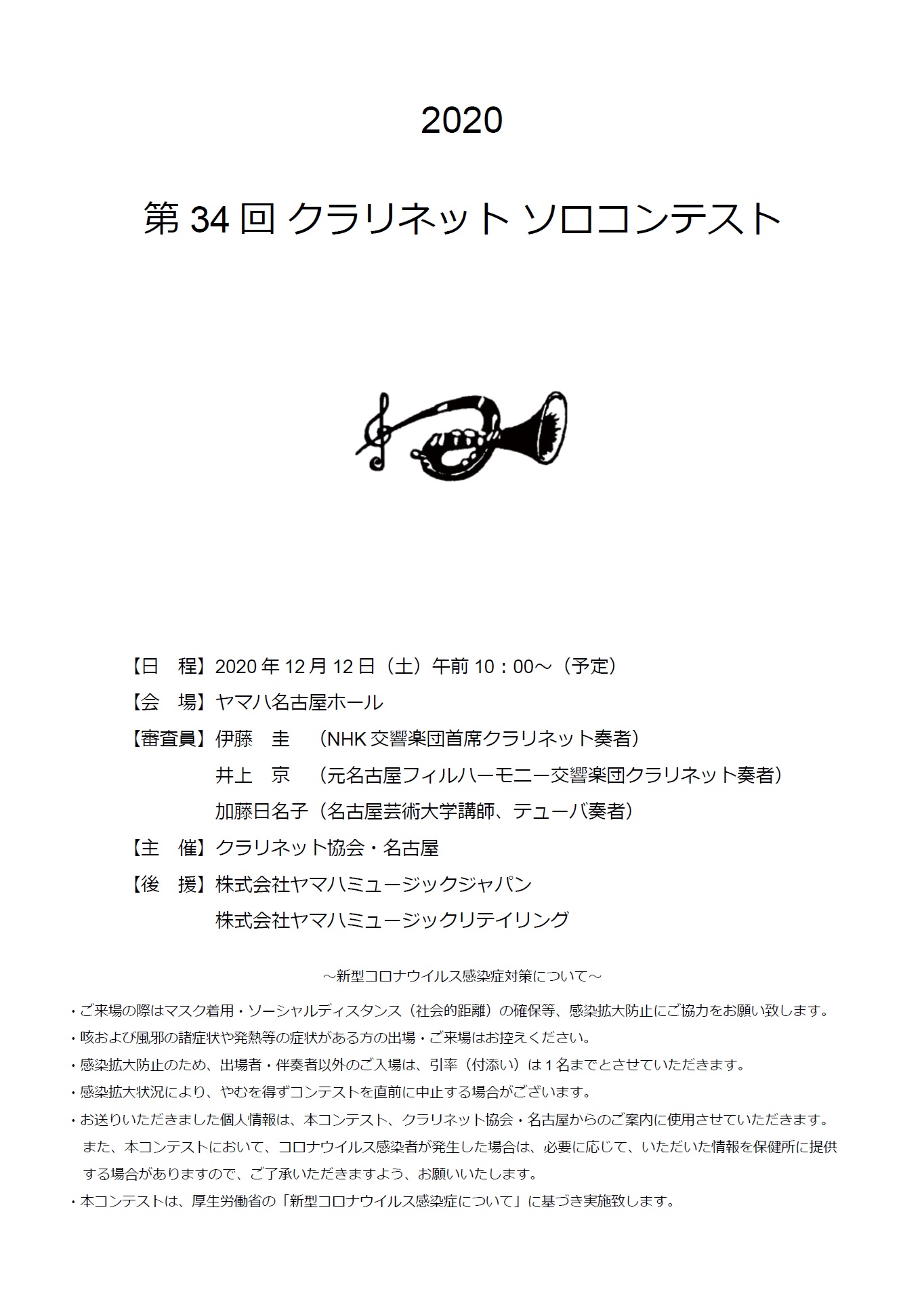 新型コロナウィルス感染症の影響がまだ続く状況ですが、今年度もクラリネット協会・名古屋が主催する、「第34回 クラリネットソロ・アンサンブルコンテスト」を開催する運びとなりました。