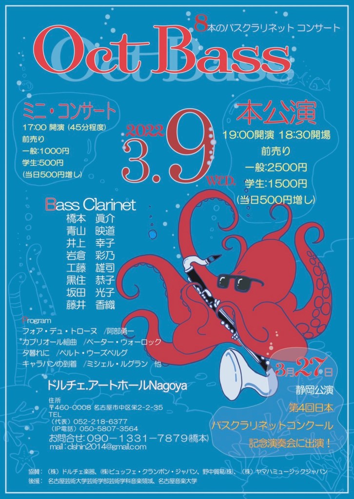 3/9(水)に名古屋近郊で活動する8人のバスクラリネット奏者によるコンサートを開催します。