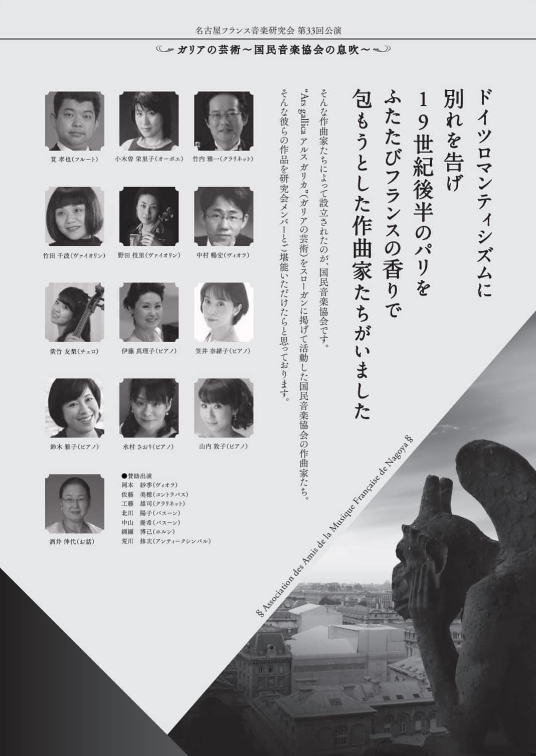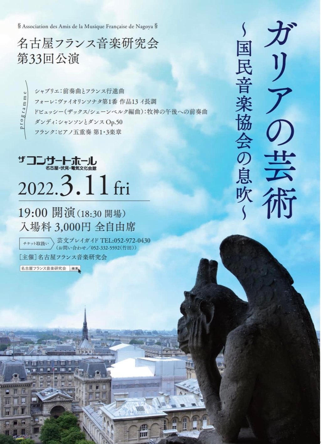 3/11(金)に、名古屋フランス音楽研究会が主催する「第33回公演 ガリアの芸術 ~国民音楽協会の息吹~」に賛助出演することなりました。