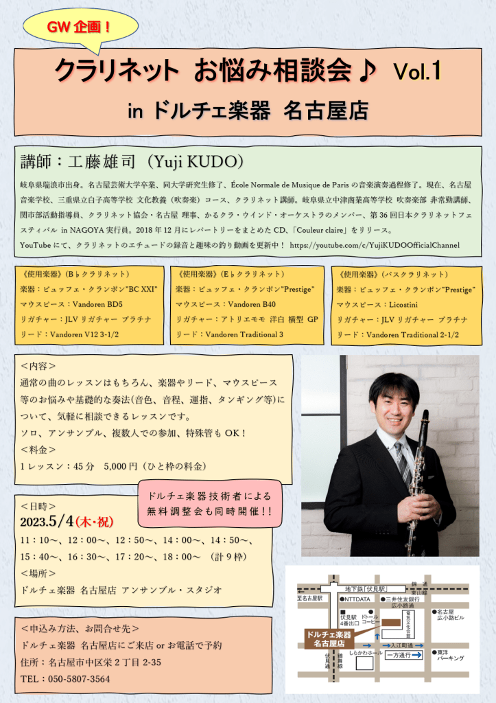 2023年5月4日(木・祝)に、GW企画として「クラリネット お悩み相談会 vol.1 in ドルチェ楽器名古屋店」を開催します!