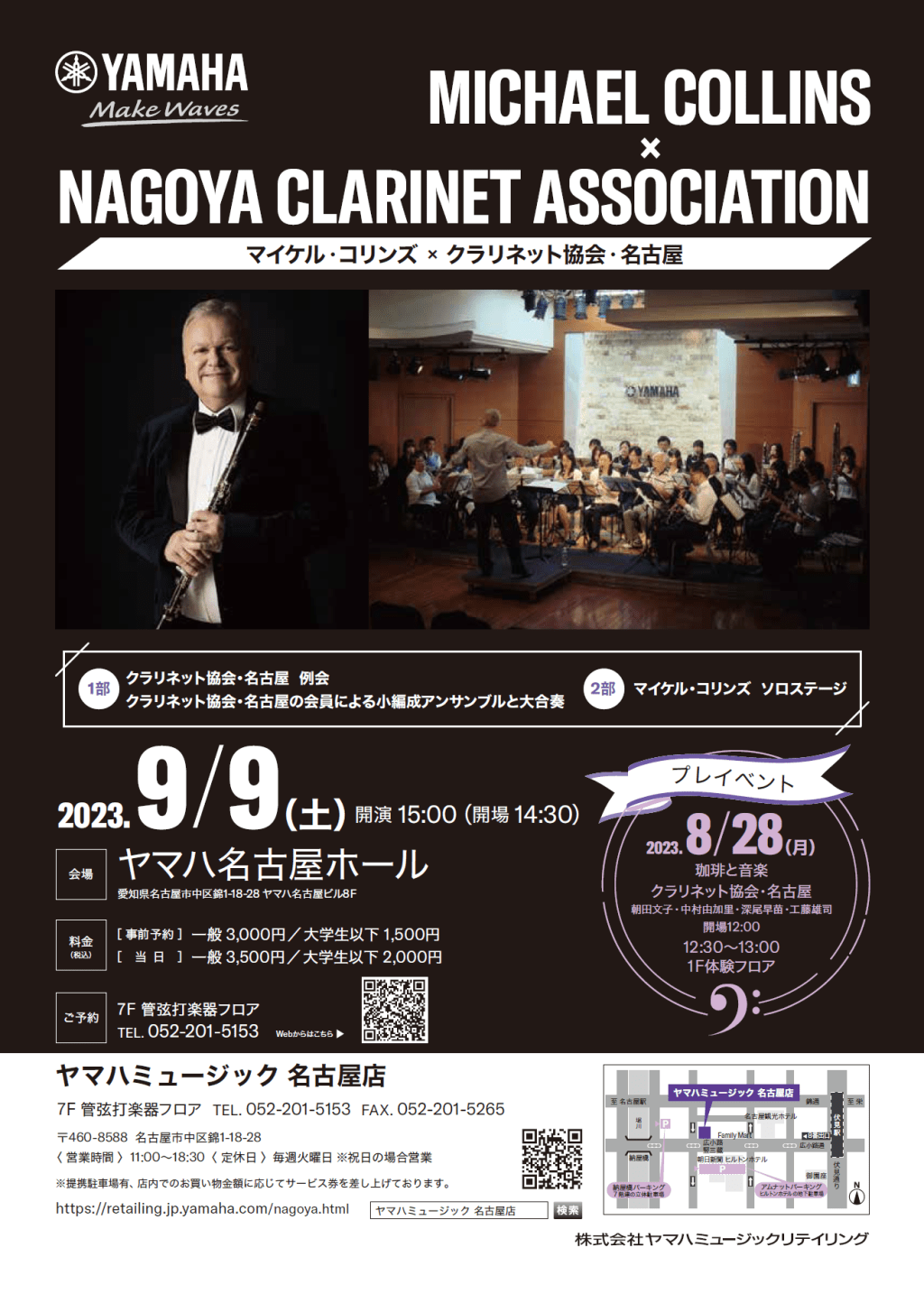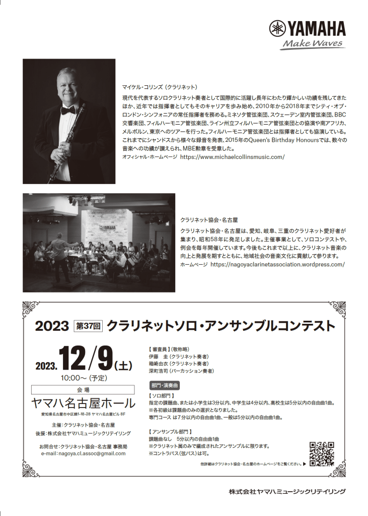 理事を務めているクラリネット協会・名古屋の2023年度例会として、9月9日(土)に、ヤマハミュージック名古屋店とのコラボ企画で、「マイケル・コリンズ×クラリネット協会・名古屋 コンサート」を開催します!