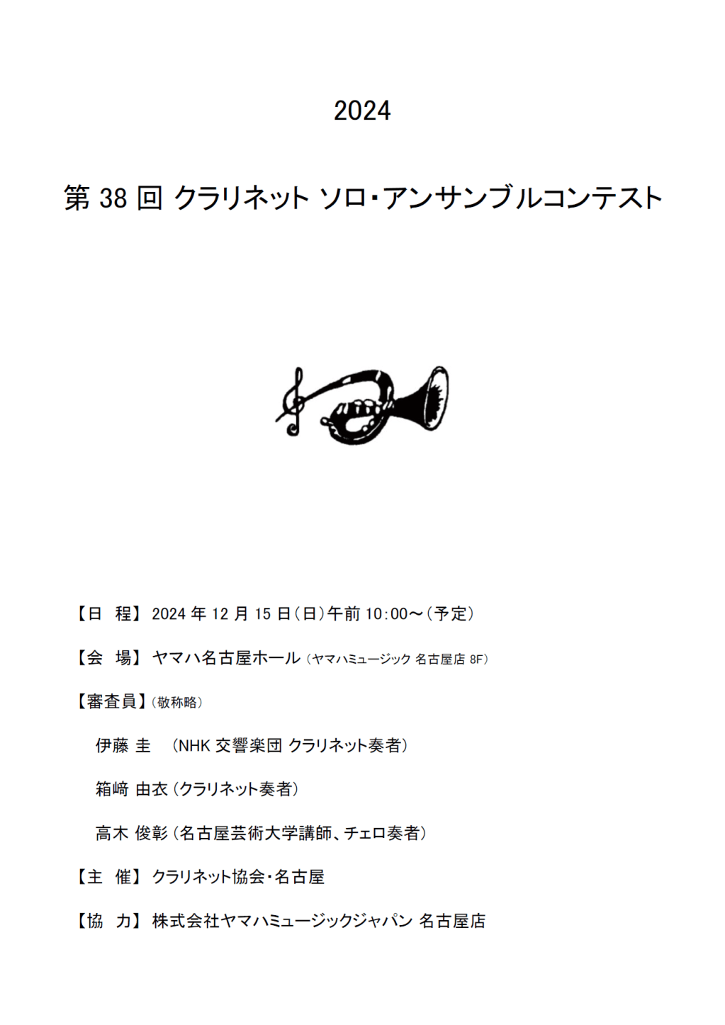 理事を務めているクラリネット協会・名古屋が主催する「第38回 クラリネットソロ・アンサンブルコンテスト」の申込締切があと10日となりました。