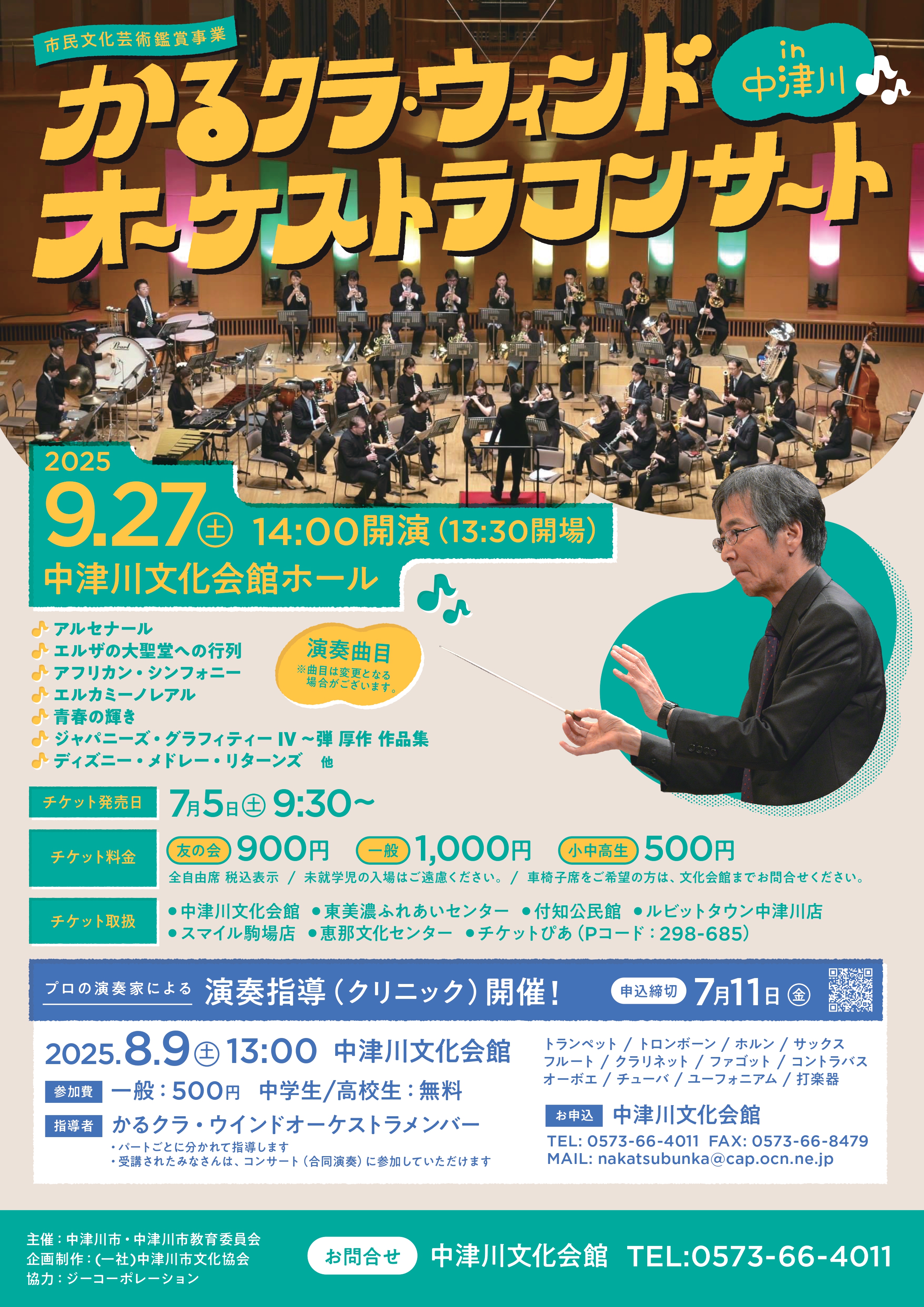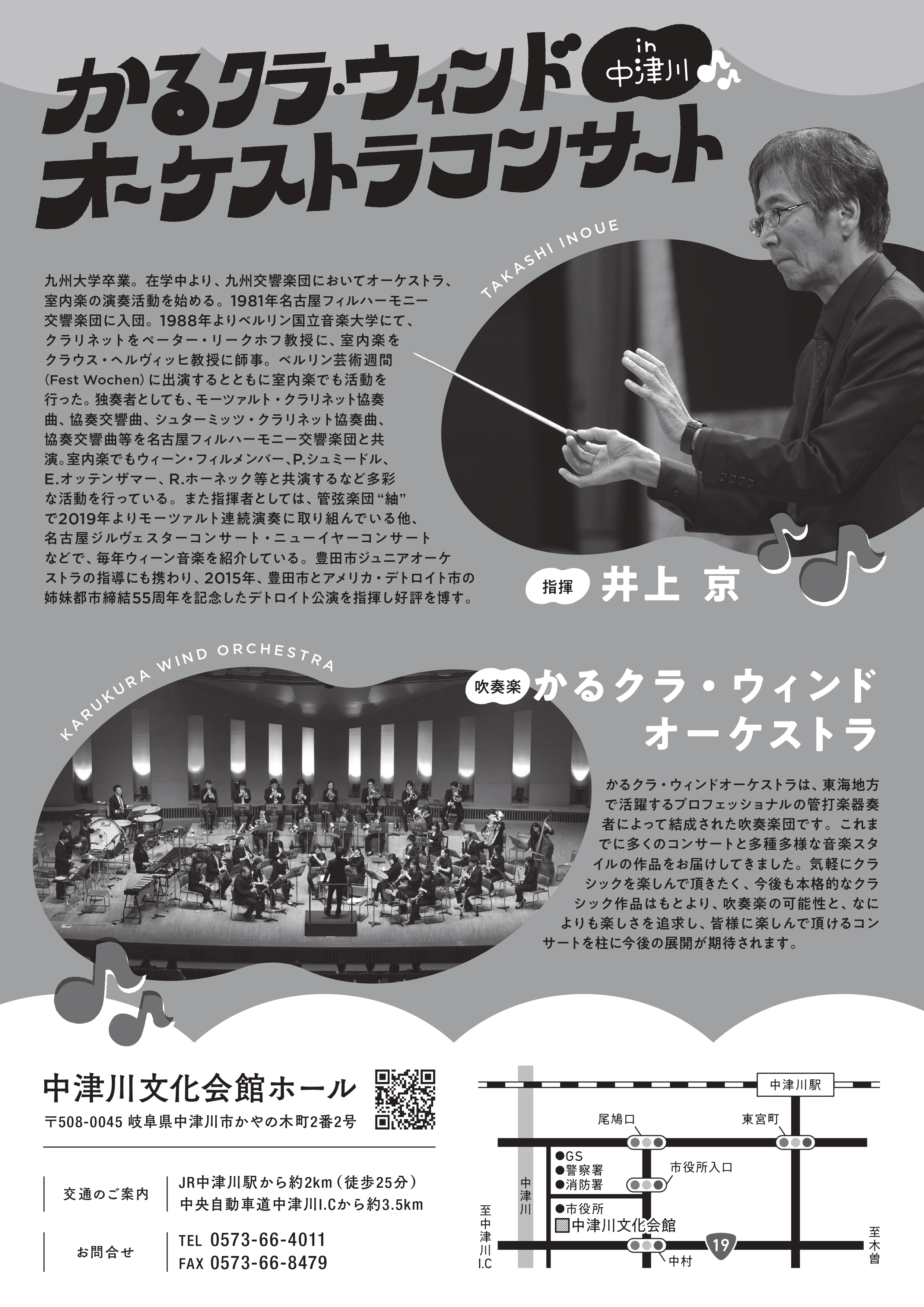 2025年9月27日(土)に東海地方で活躍するプロ奏者による吹奏楽団「かるクラ・ウインドオーケストラ」が市民文化芸術鑑賞事業として中津川文化会館ホールで演奏します。