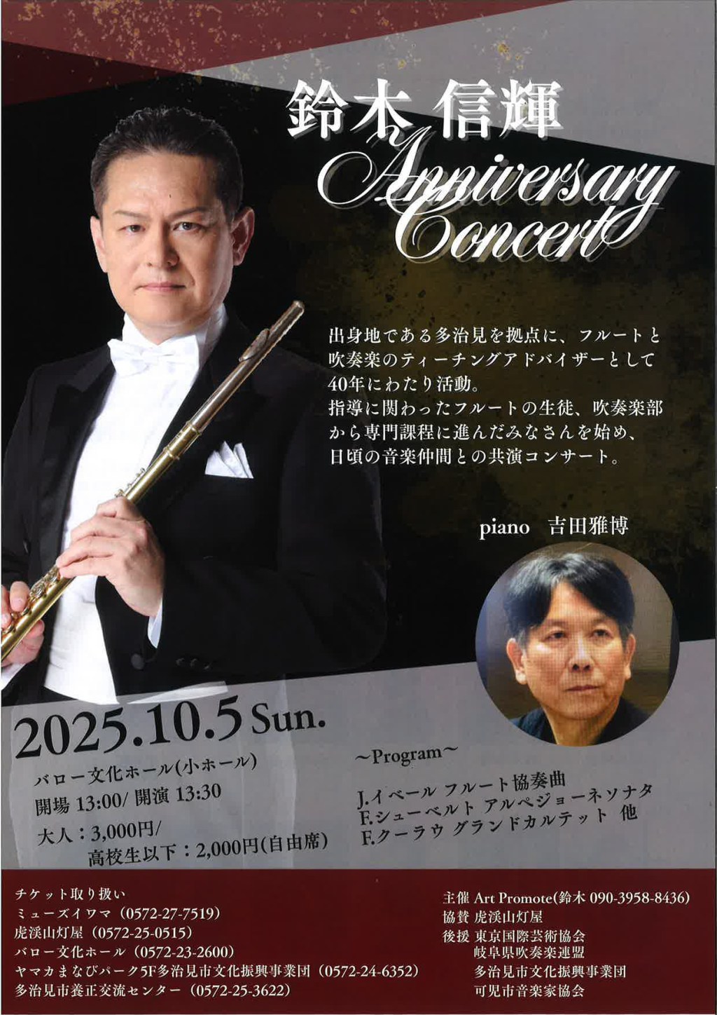 2025年10月5日(日)にバロー文化ホール(多治見市文化会館)小ホールにて、高校生の時に吹奏楽の講師として来てくださり、とてもお世話になったフルートの鈴木信輝先生の還暦記念コンサートに出演します。
