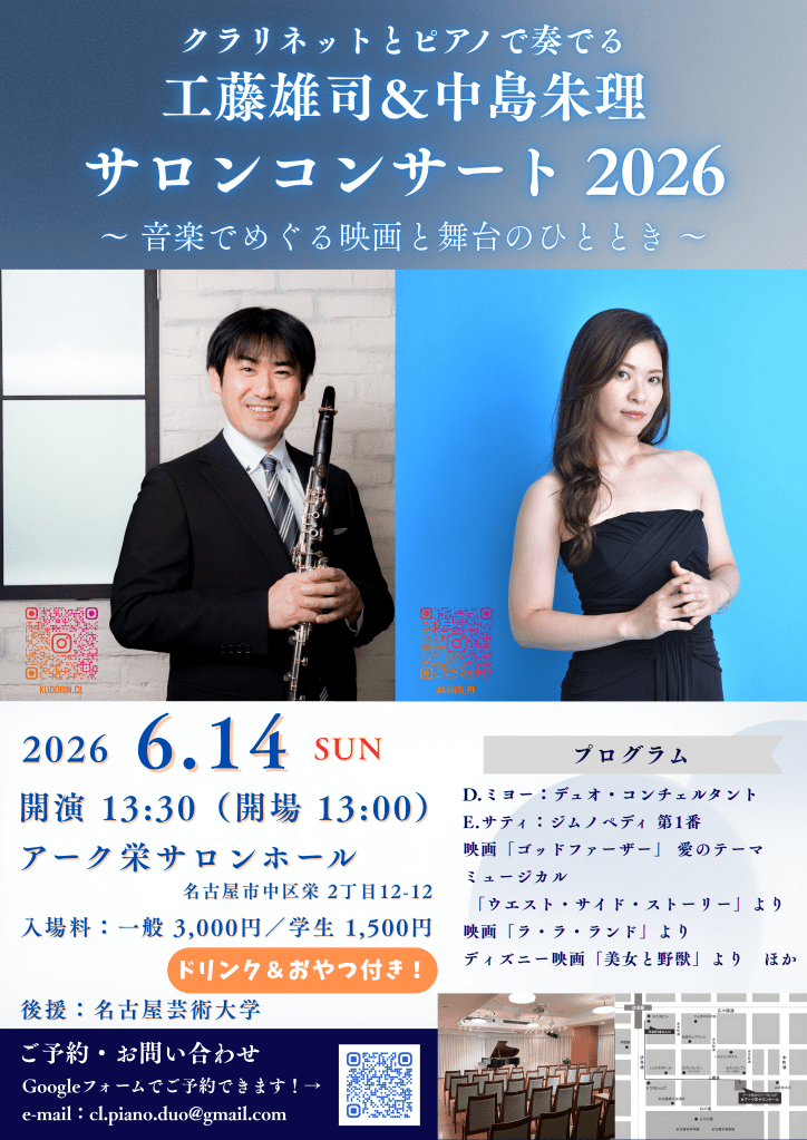 日にちは6/14(日)で、名古屋の伏見駅近くの「アーク栄サロンホール」にて、映画音楽やミュージカル作品を中心に演奏します。